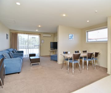 Two storey, accessible 4-bedroom apartment ideal as group accommodation for sports clubs, corporate teams and large/extended families. Sleeps 9 in beds. Two bedrooms downstairs, 2 upstairs, all have ensuites. Ground floor: bedroom 1: accessible king bedroom with a roll-in, wet floor shower. Bedroom 2: king bed. Upstairs: bedroom 3: king bed and single bed. Bedroom 4: two single beds. Lounge/living area has dining table & chairs for nine. Well-equipped kitchen with fridge freezer, oven and dishwasher. Keep cosy or cool with air conditioning. Soundproofed room, double glazing & electric blankets for a deep sleep. Smart TV (Chromecast), high-speed Wi-Fi. Great range of complimentary tea/coffee, iron, hairdryer, extra pillows & blankets